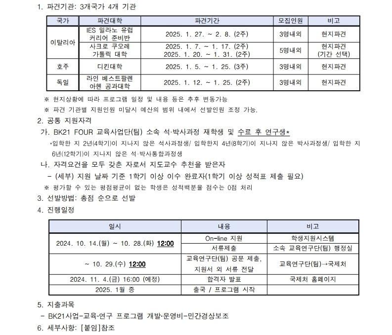 fnctId=bbs,fnctNo=14020 작성일 2024.10.14 수정일 2024.10.14 작성자 장은영 조회수 33 [BK21] 2024학년도 BK21 FOUR 참여 대학원생 국제교류 Create Global Leader 프로그램 지원자 모집 안내 첨부파일 BK21 참여대학원생 국제교류 Create Global Leader 프로그램 운영계획(안)(BK21사업단).hwp 미리보기